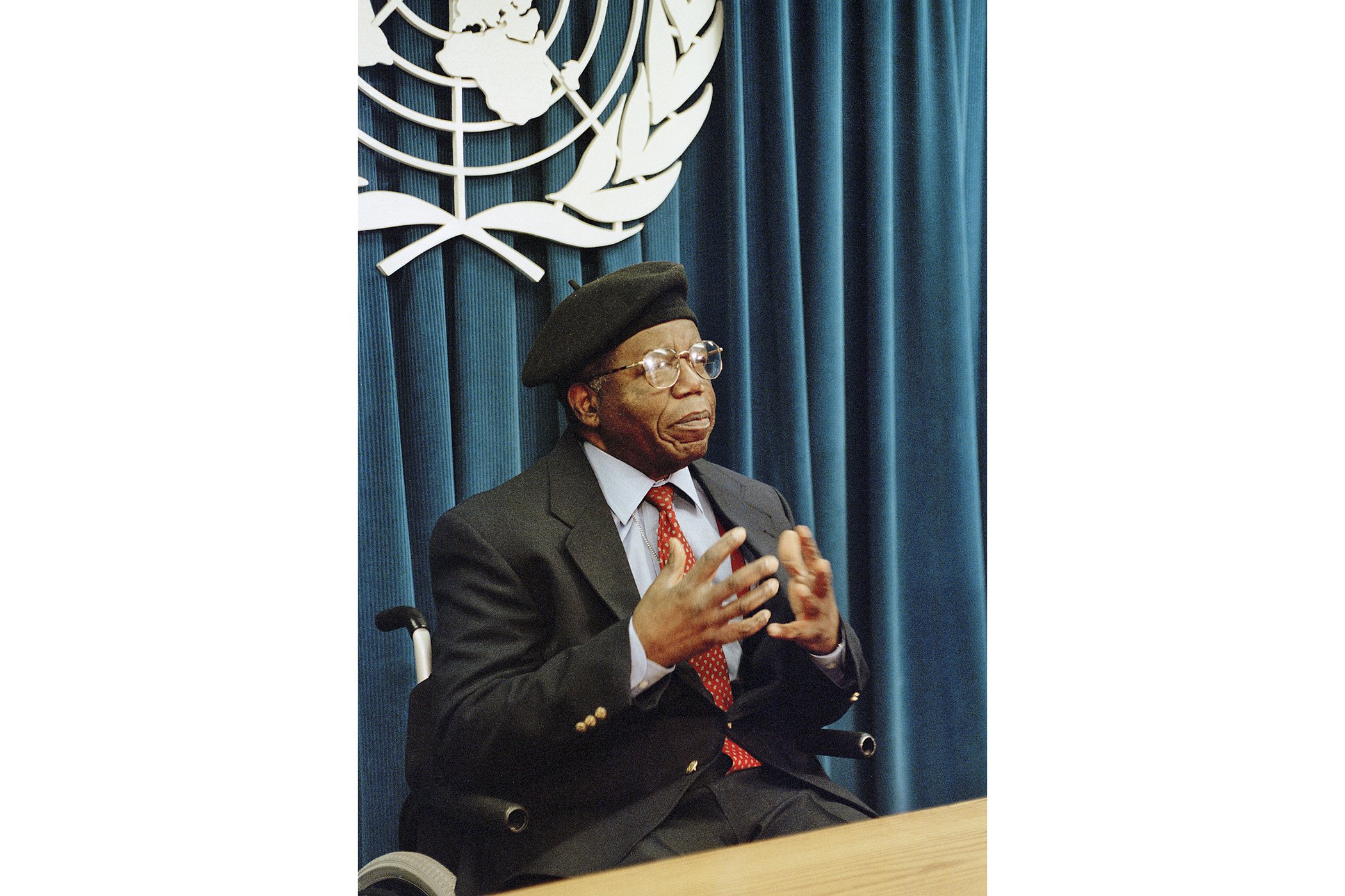 Nigerian author Chinua Achebe holds press conference following his appointment as Goodwill Ambassador for the United Nations Population Fund (UNFPA) on Jan. 7, 1999.